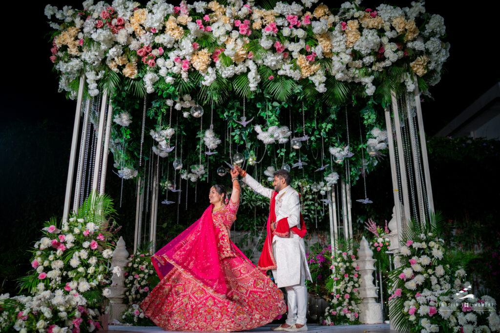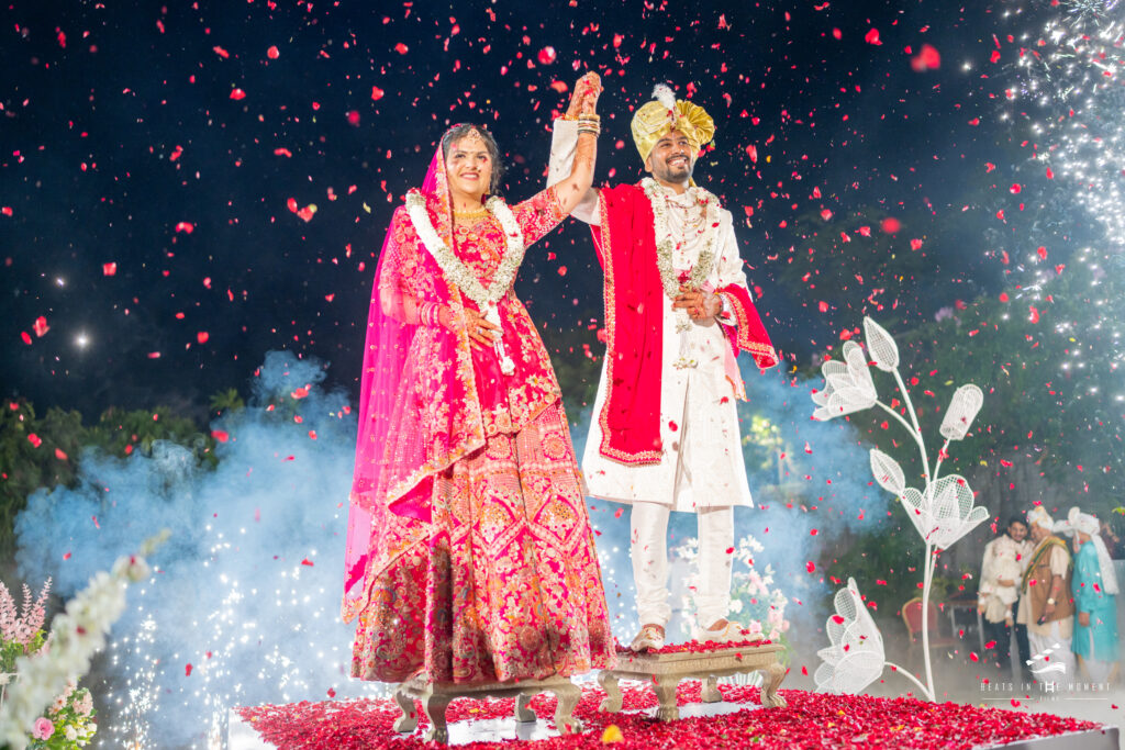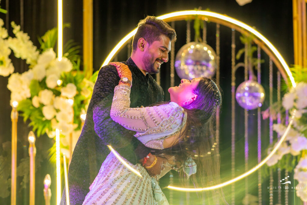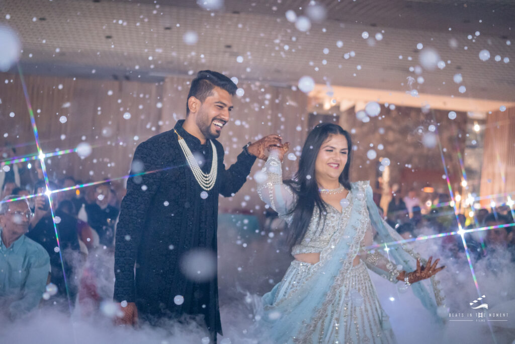 The production team had installed a full SFX rig – dry ice, confetti blowers, bubble machines – and DJ Sanjay’s setup anchored one end of the stage while the live percussion ensemble anchored the other. The décor was done. The lighting was done. And then Dhwani and Tarang walked in.
