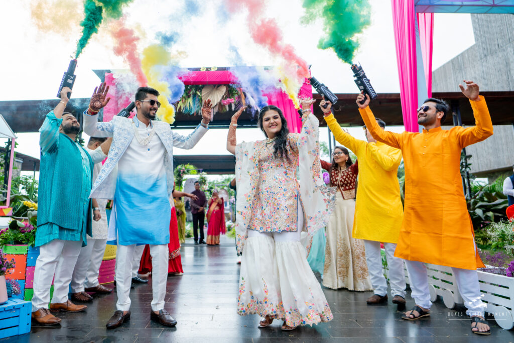 Then the couple entered – flashmob first, colour bombs second – and the room completely lost its mind. Anchor Eshaan took over from there, running games that had aunts and uncles competing as hard as the cousins.