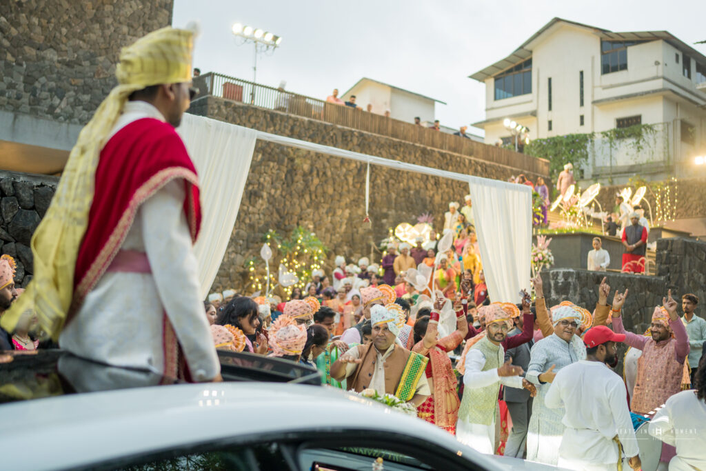A Nashik dhol band and ghodi led the procession. The SafaWala team had dressed baraatis on-site – matching safas, the whole group moving together with an energy that builds on itself. Iitar was plated and ready at the gate; guests welcomed with fragrance before a single word was exchanged.