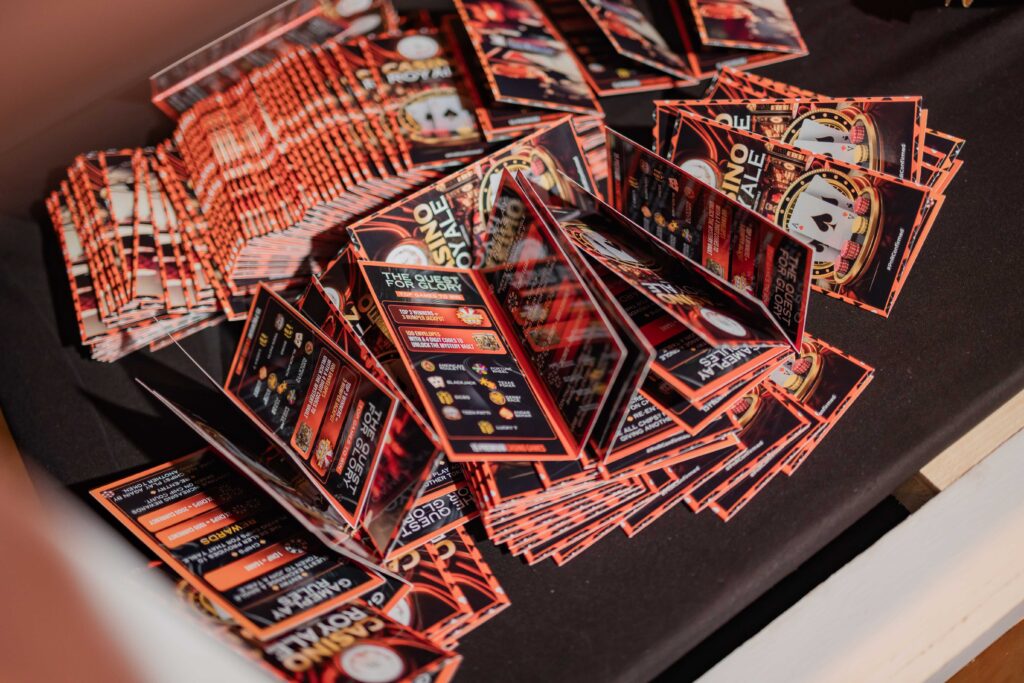 A full-scale setup was created with live roulette, poker, and blackjack tables, all operated by professional dealers. Custom chips and branding brought consistency to the theme, while a central casino vault installation became both a visual anchor and a high-traffic attraction.