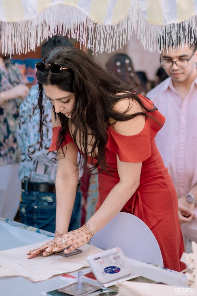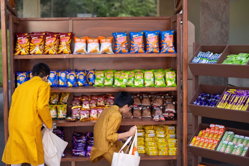 Instead of receiving standard gifts and food items, guests could walk through a curated setup, take a bag, stamp it with their choice of travel stamps from the collection, and choose their own hampers. Designed like a retail space, it added a layer of choice for all the guests. To make the experience exactly like a retail space, every guest got a customised bill at the end, payable only with love and blessings.