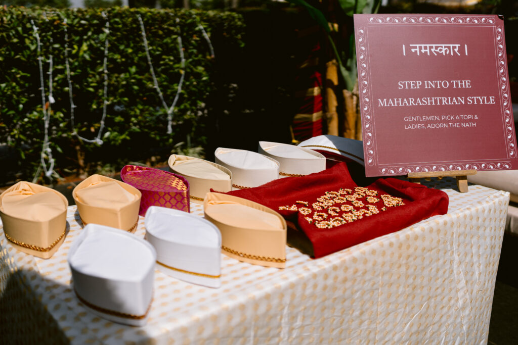 For the Mehendi, we designed a warm, earthy setting with mustard drapes, terracotta textures, and fresh florals. But what truly elevated the experience was the Maharashtrian Nath & Topi station, where guests could pick accessories and instantly become part of the celebration.