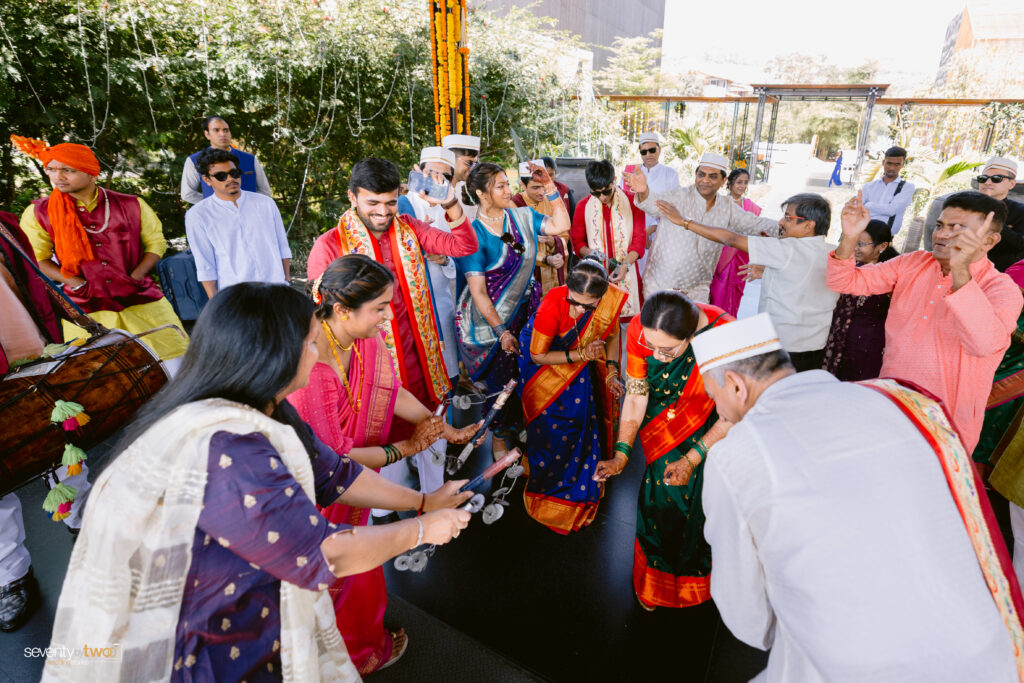 The celebrations began with traditional Lezim dancers welcoming guests with dhol beats and infectious energy. Right from the start, the experience felt immersive, interactive, and deeply rooted in culture – something Shubhtithi Weddings prioritises as Indian wedding planners in Mumbai. It wasn’t just an entry; it was a statement of what the wedding would become.